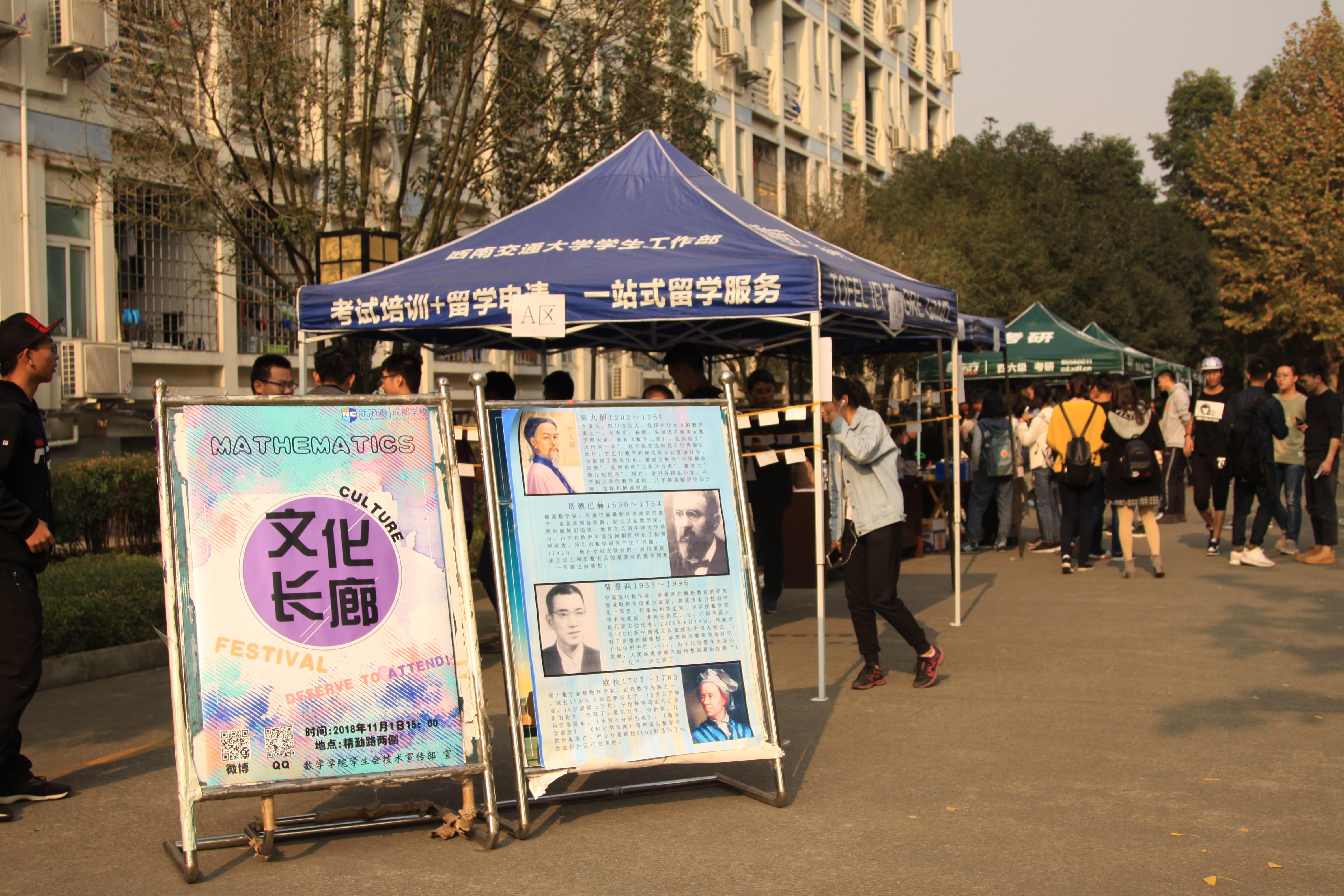 11月1日下午3时,数学文化节系列活动之文化长廊在精勤路两侧隆重举行。bwin必赢国际中国官方网站团委书记邓思然老师、17级辅导员谢童心老师、学生会主席和副主席到场指导活动有序开展。